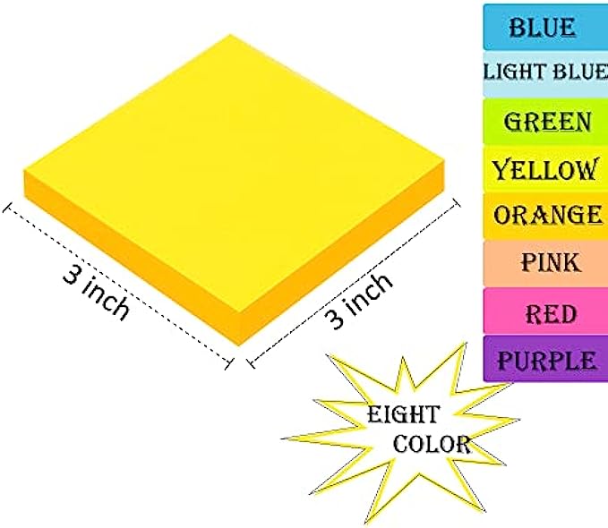 (8 Pack) Sticky Notes 3 x 3 in , 8 Colors Post Self Sticky Notes Pad Its , Bright Post Stickies Colorful Sticky Notes for Office, Home, School, Meeting, 84 Sheets/pad