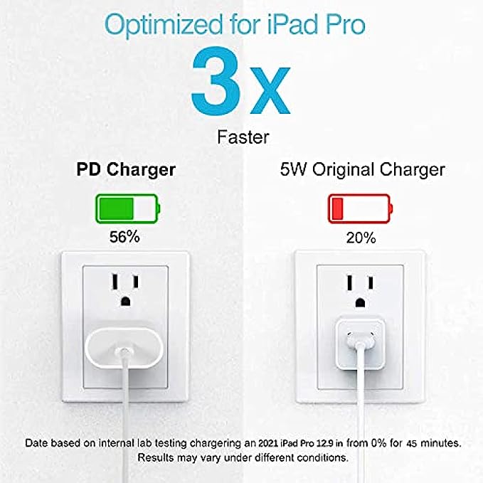 • 20 Watt High-Speed Charging - ipremium latest generation usb c fast charger combined with 6.6 foot usb c cable can provide high speed charging for iPad Pro, full charger 2021 iPad Pro 12.9 inch in 2.5 hours, 3X faster than original USB charger.