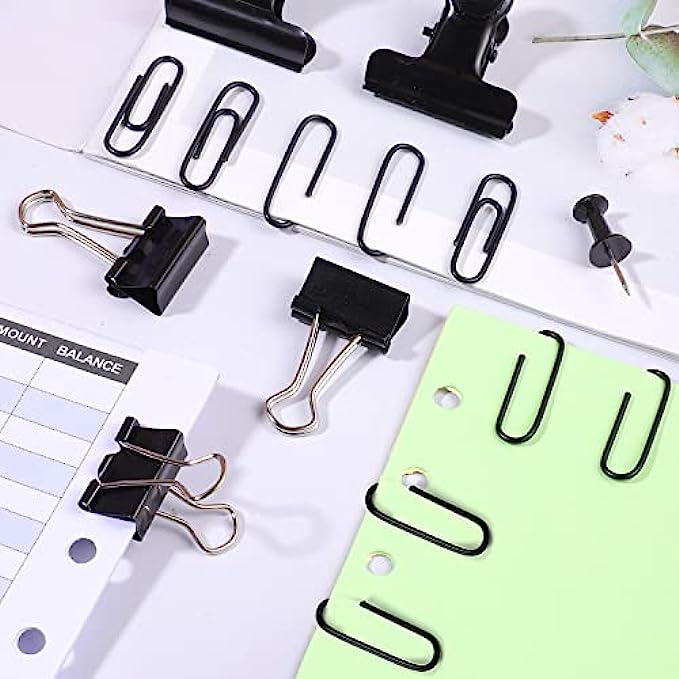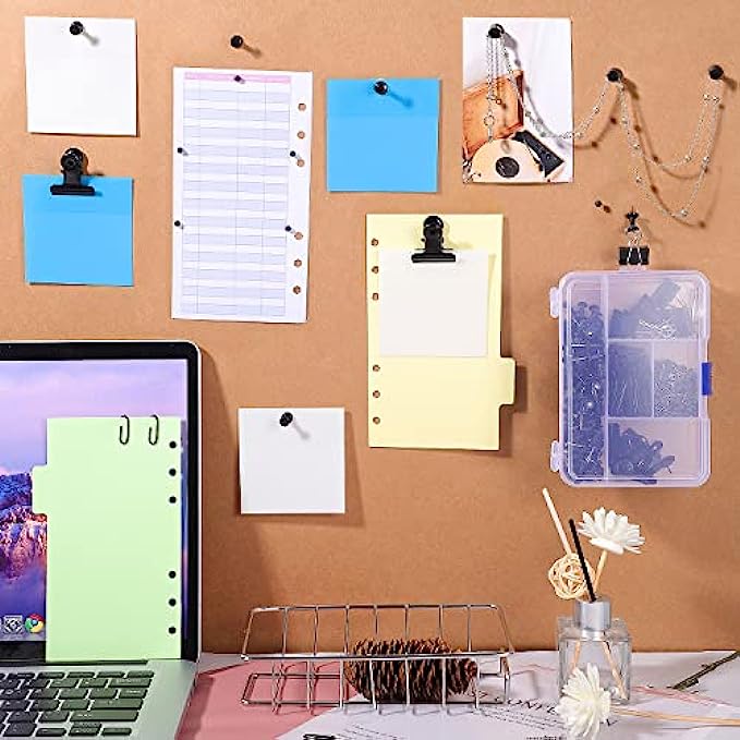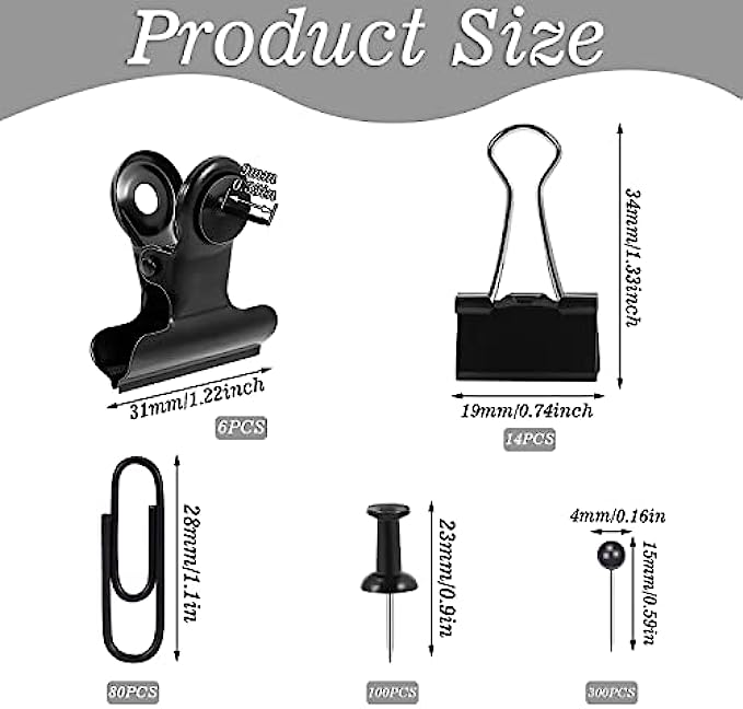 【Easy to Use】The black thumb tacks is inserted directly into the cork board and will not fall off. It is suitable for bulletin boards and maps to mark important information. The black binder clips and paper clips are easy to open and close, suitable for storing papers, notes, photos, etc
