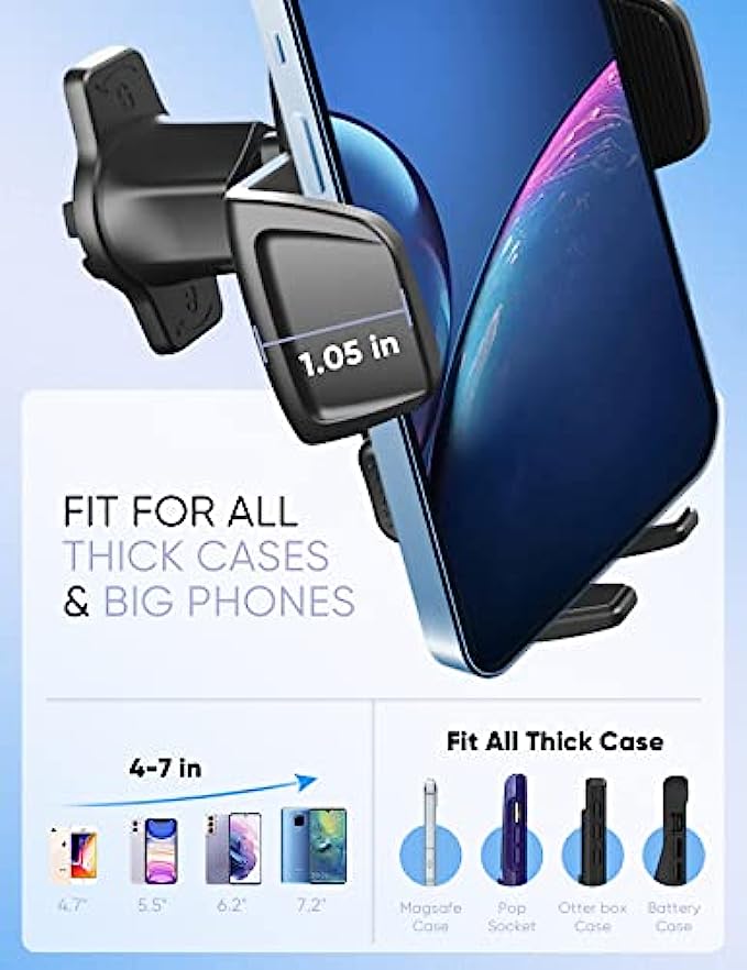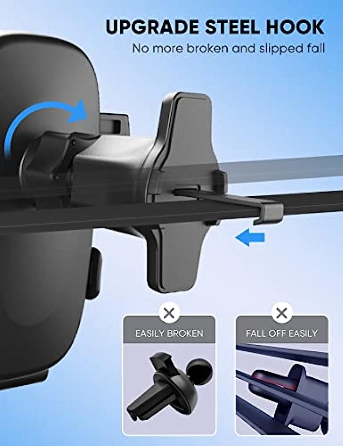 • ?Upgraded Steel Hook - The metal phone mount for car vent clip is 70% longer and sturdier than other air vent clips, compatible with 98% of horizontal and vertical air vent blades, as well as solving the problem of the hook being easily broken. Note: The car phone holder mount vent clip are not suitable for round air vents.
