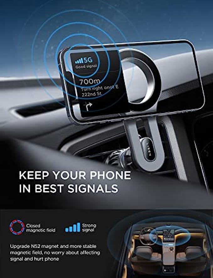 • ?More Stable, Less Blocking: LISEN brand laboratory has upgraded this magsafe car vent mount from 3 directions.①Upgrade extension arm to protect your phone overheating crash; ②Cell phone holder for car mount with most stable "Steel Hook";③Magnetic phone car mount that has the strongest magnet force, which can hold up to 10 iPhone 13 Pro Max. LISEN provides at least 1 years of user service.