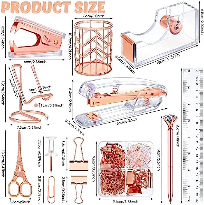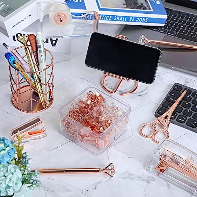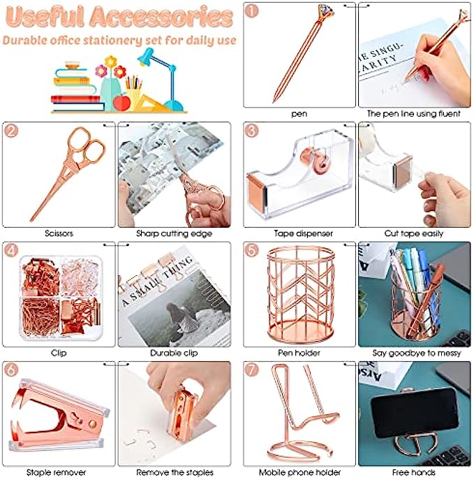 Packing Listing: you will get a set of desk accessories, which includes 1 stapler, 1 tape holder, 1 staple remover, 1 pen holder, 1 box of staples, 1 mobile phone holder, 2 diamond pens, 1 ruler, 1 scissors and 1 box of binder clips; This set can meet your needs in daily life and work