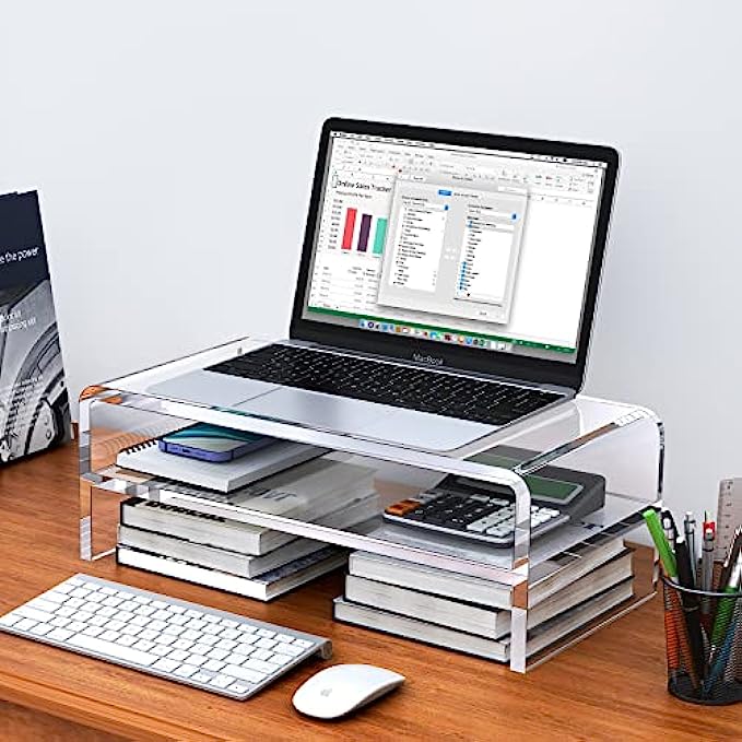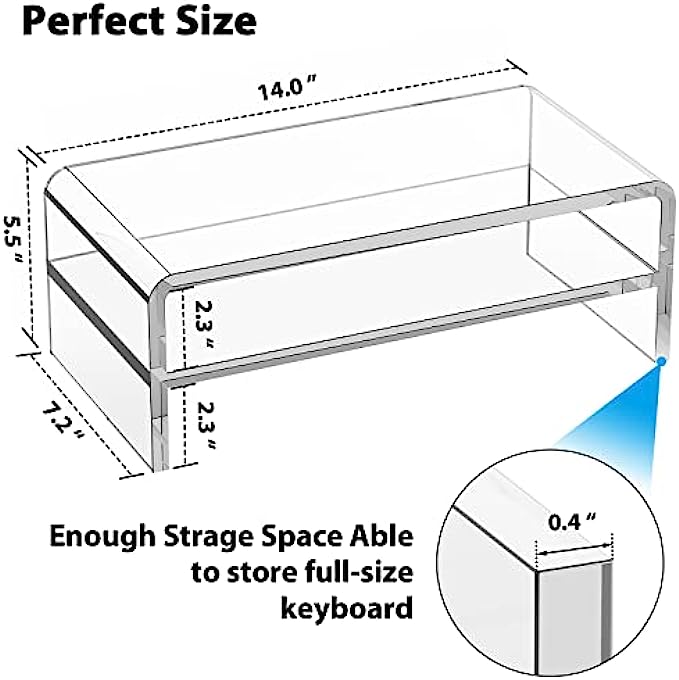 【MULTIFUNCTIONAL ACRYLIC STAND】The clear acrylic stand can not only place a computer monitor or laptop on the desktop, its strength and aesthetics can also be used for a variety of storage, such as organizing set-top boxes and remote controls under the TV; organizing files in the office ; organize books in the dormitory.