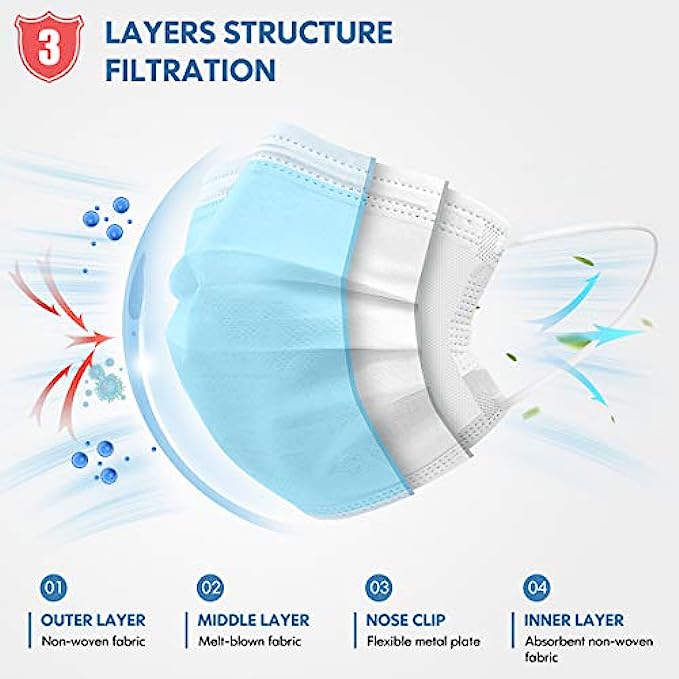 • 3Ply Face Mask: Outer blue layer with non-woven fabric can effectively filter particulate pollutants in the air. Middle melt-blown cloth layer can effectively keep away from impurities. Inner absorbent white layer which is gentle and more breathable