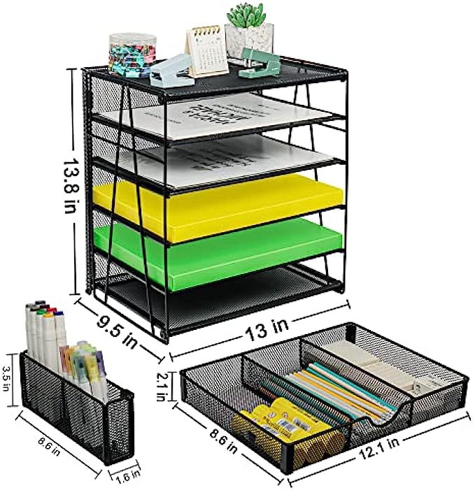 【Unique Mesh Desk Organizer】Desk file organizer you can organizer printed paper, letters, statements, folders, documents, magazines, desk accessories, desktop organizer with 5 Stackable trays and 1 sliding drawer + a pen holder divided in two. Desk organizer is the highest end of office organization design.