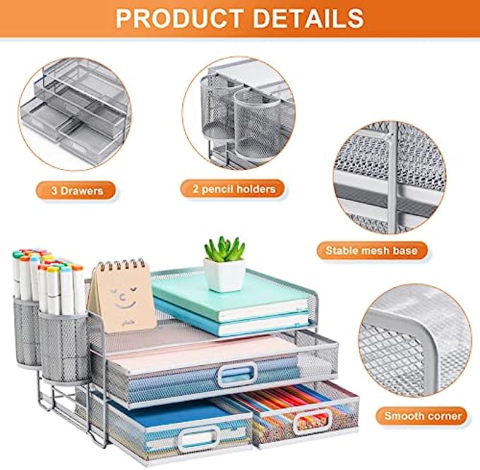 【Convenient Personal Storage】Compared with other mesh desktop organizer. The Multi-drawer design can help you store some important papers, whether it is personal letters or personal information can provide you with a certain privacy protection space.