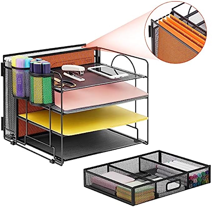 【Perfect Desktop File Organizer】Our Office Desk Supplies Organizer is made of 4 sliding trays + 2 Hanging Pencil Holders + 1 sliding drawer which has enough storage space to accommodate all office supplies, such as pens, pencils scissors, folders and Letter/A4 Size Paper