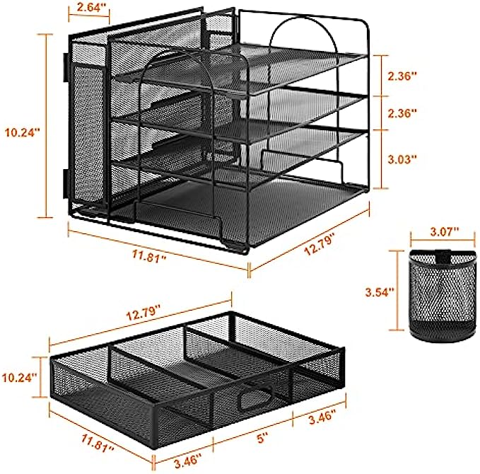 Marbrasse 4-Trays Desk File Organizer with 2 Pen Holder, Desktop Hanging File Holder with Drawer, Paper Letter Tray Organizer, Mesh Office Supplies Desk Paper Organizer for Home Office (Black)