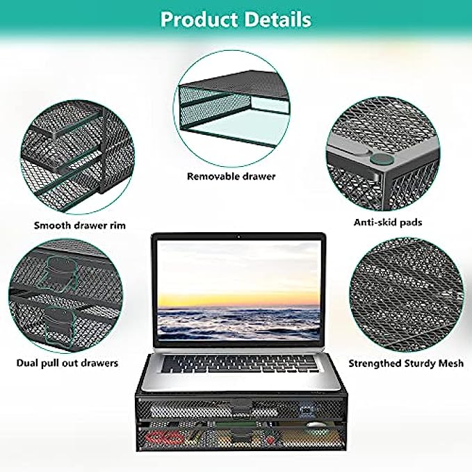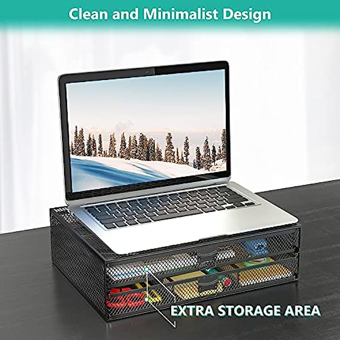 WALI Metal Mesh Monitor Riser Desktop Stand with Storage Drawers for Computer, Laptop, LED, LCD, OLED Flat Screen Display, and Printer (STT006-B), Black