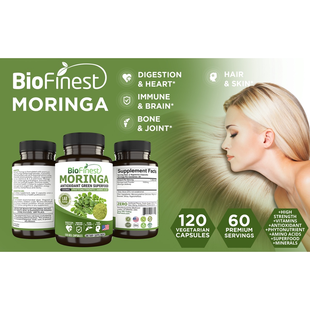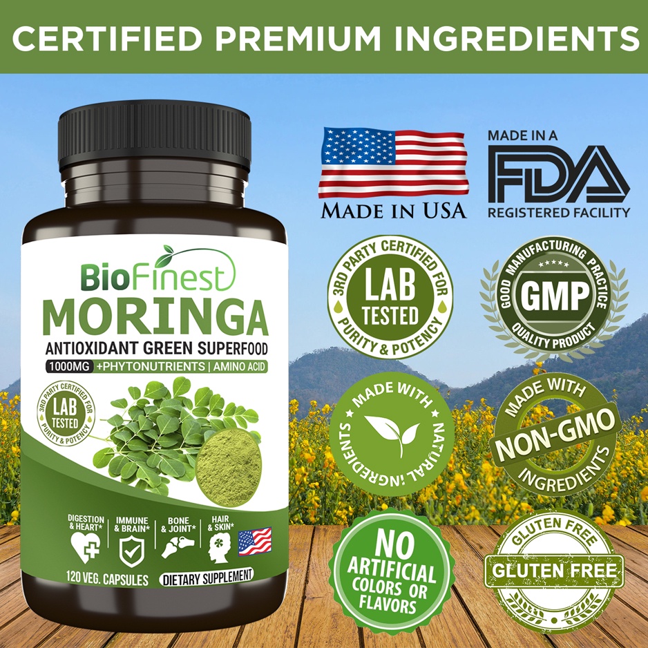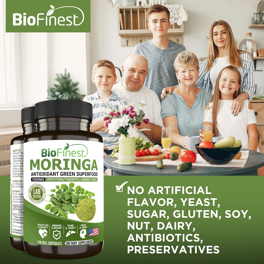 Biofinest Moringa Leaf 1000mg Supplement - Antioxidant Superfood Powder- Energy Skin Blood Sugar Immune (120 capsules)