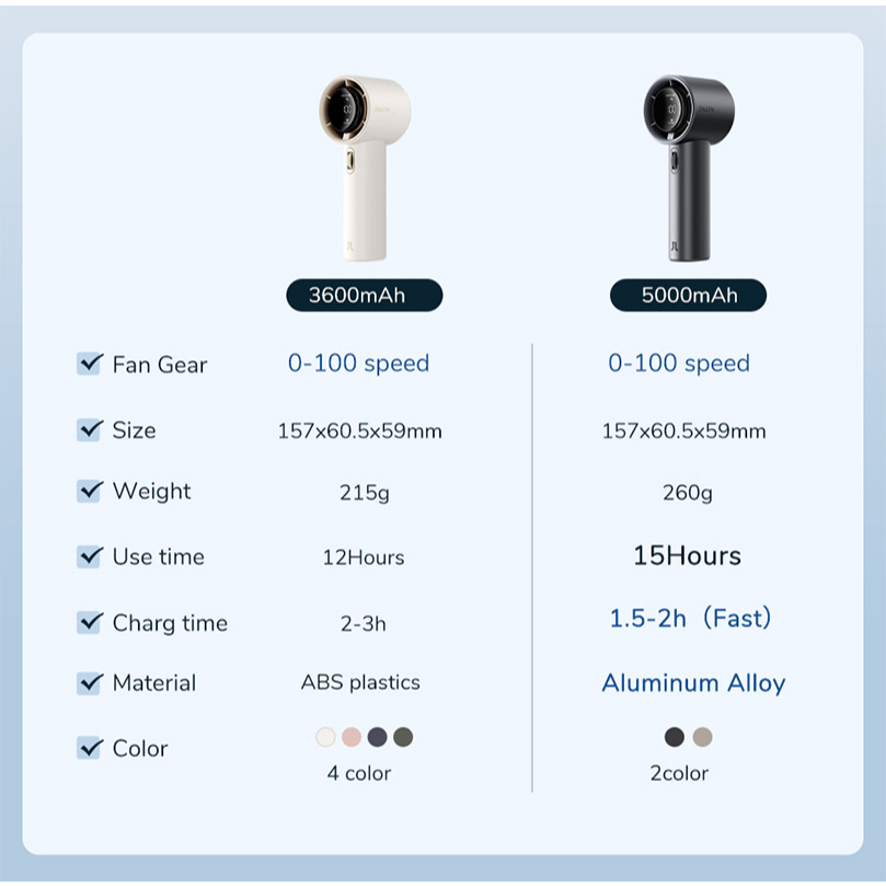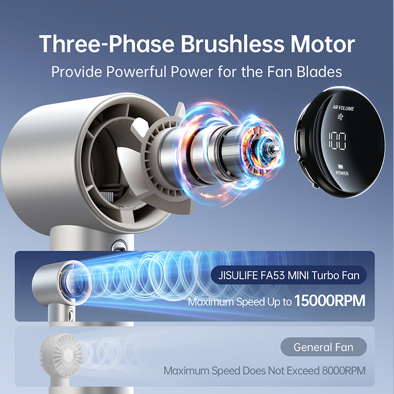 JISULIFE Portable Handheld Fan100 Gear Strong Wind Speed Metal Body Digital Display Adjustable