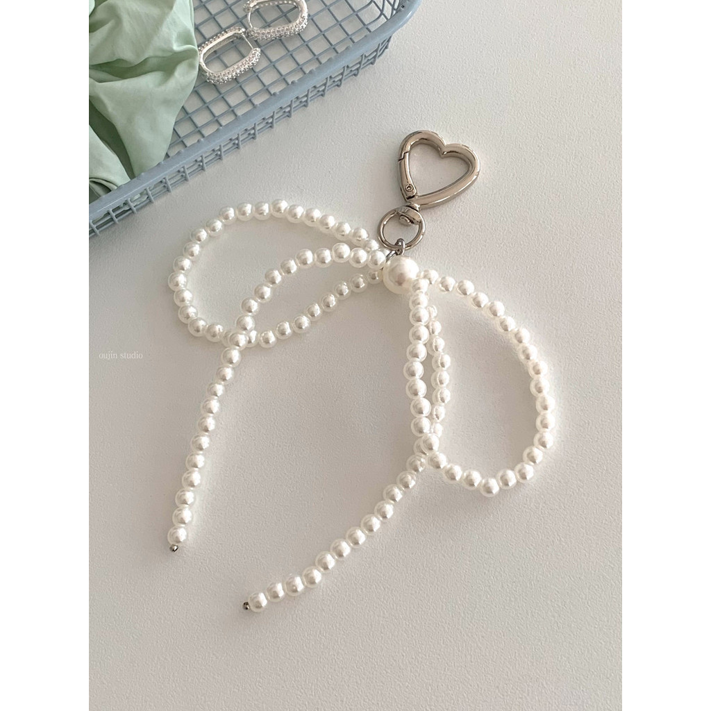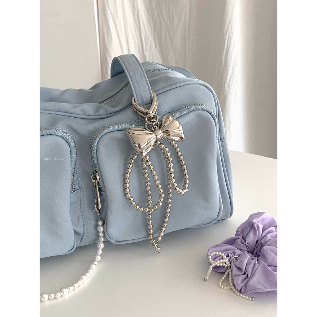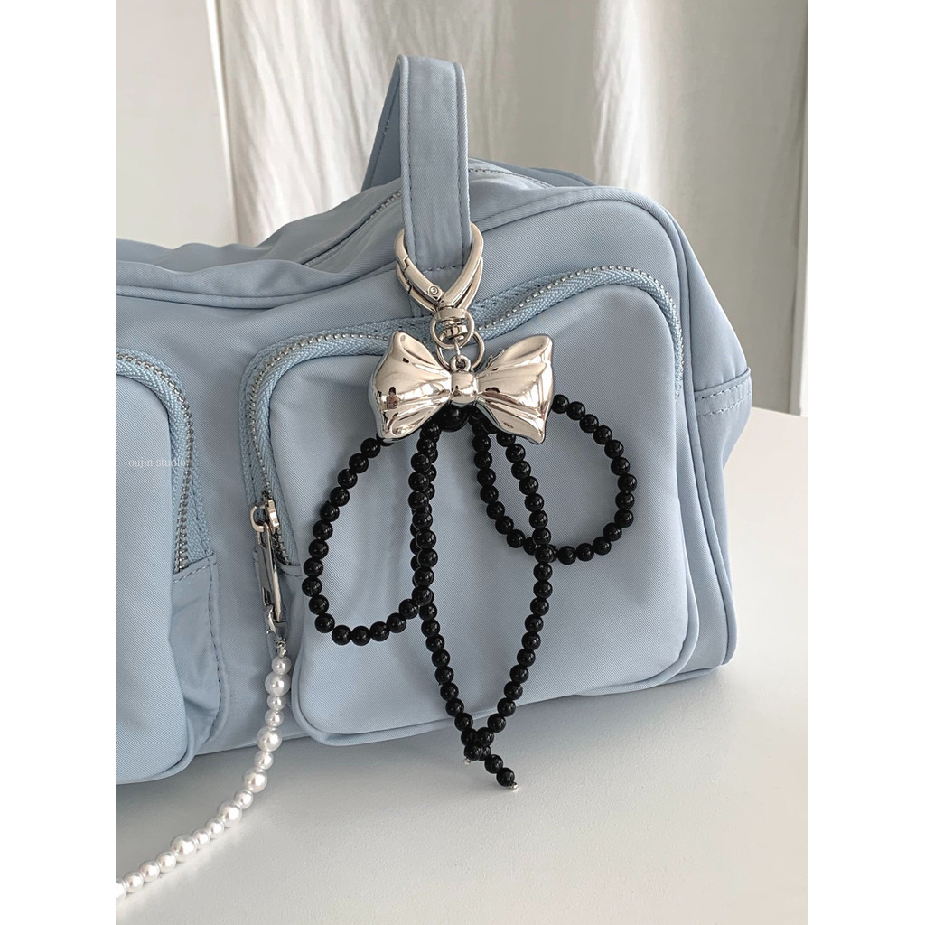 Korean Niche ins Sweet Girl Pearl Silver Bow Beaded Bag Pendant Car Keychain Bag Pendant
