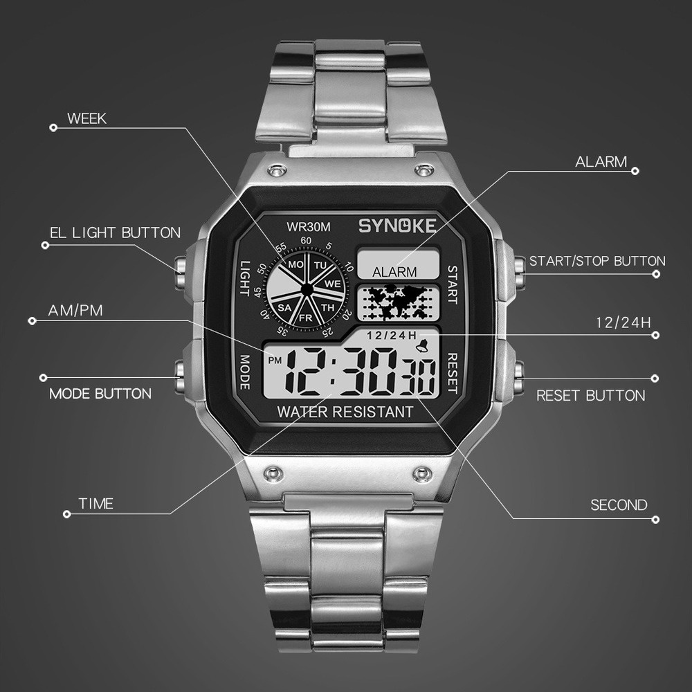 Men Watches Waterproof LCD Colorful Cold Light Watch Stainless Steel Digital Watch 5 Alarm Clock World Time Fashion Watches